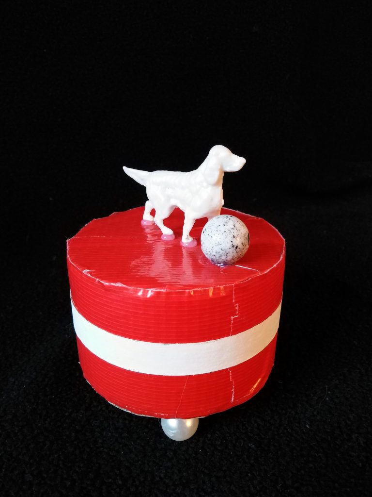 I had a bunch of old music boxes that I did not want to throw away so I decided to make my own. So I took out the part that makes the music and found new housings for them. I started with an empty tape roll. Then I glued a cardboard top and bottom top it. Next, I covered it in tape, and last I put the little dog on top.