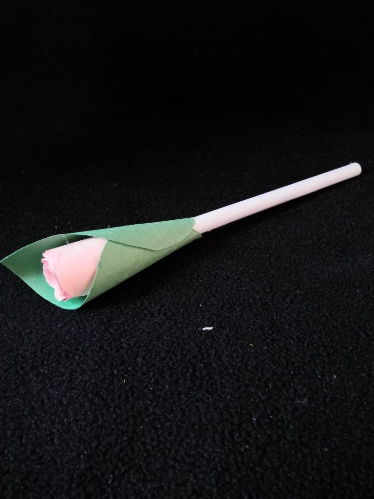 I took inspiration from a few different videos to come up with my own style of flower. it is individual petals wrapped around the stem. it is similar to the duct tape flowers.