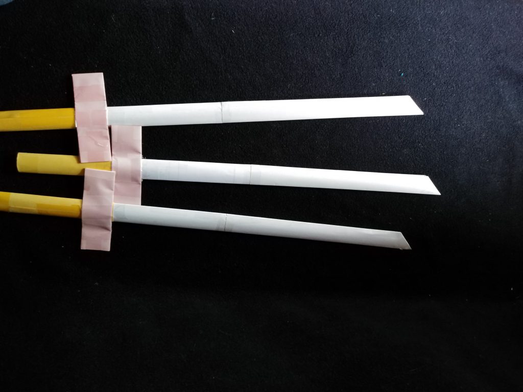 These swords are not actually origami because they use tape to hold them together, but they are surprisingly strong and are fun to play with.