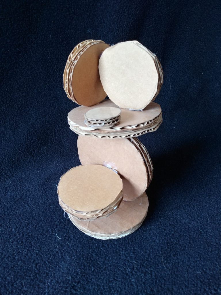 Downtown Milwaukee is full of art sculptures. they are what inspired me to make this piece. i cut circles out of cardboard and glued them together at random. sometimes no plan is the best plan.