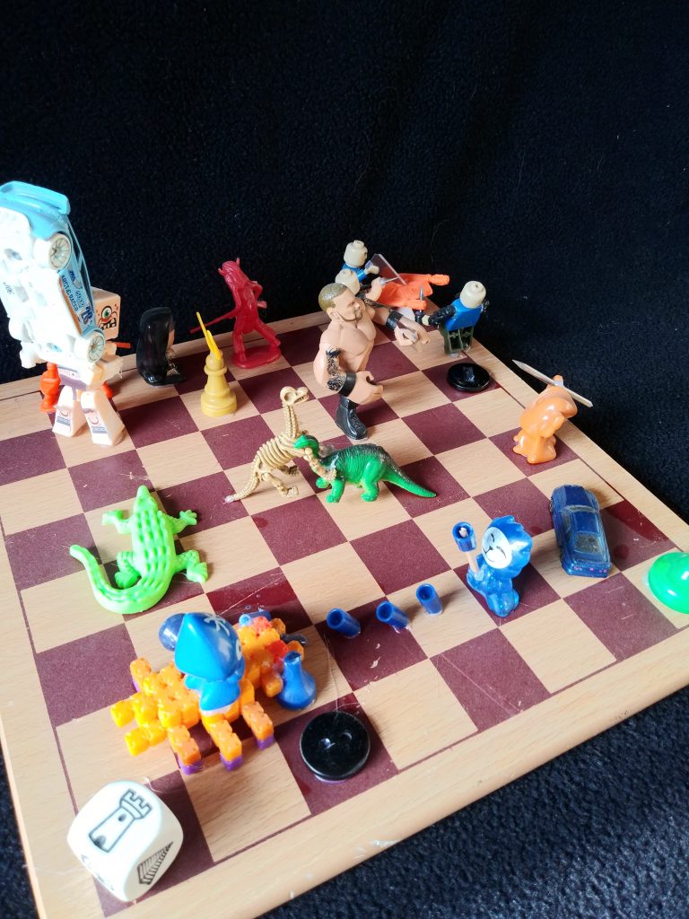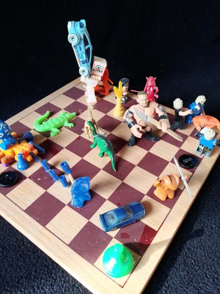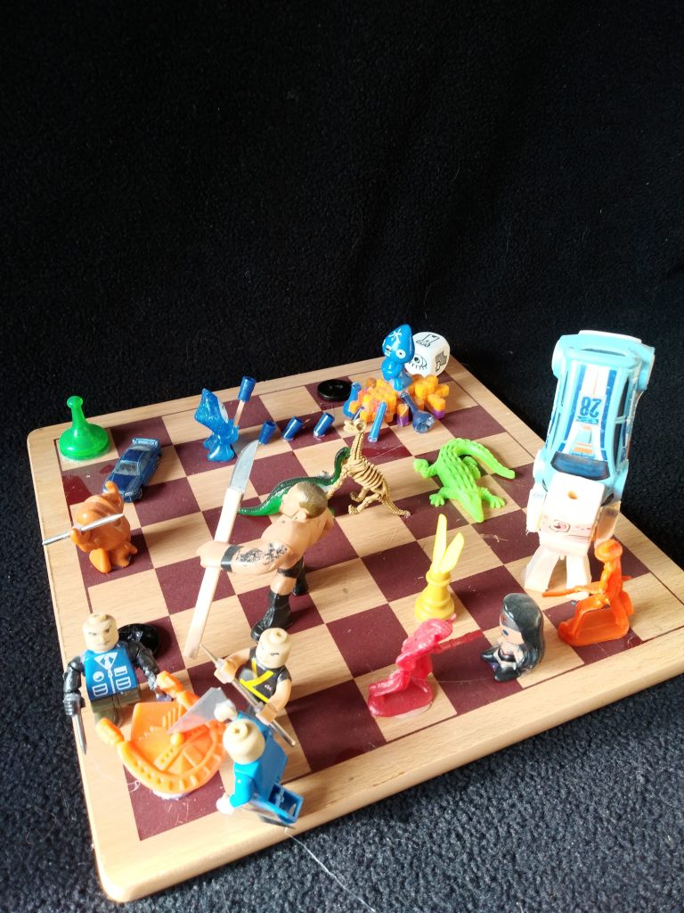 For this art project, I took inspiration from the checkerboard. instead of traditional chess or checkers pieces, I decided to use toy figures to portray a battle. to make it I looked at it from every angle and made different figures be battling each other.